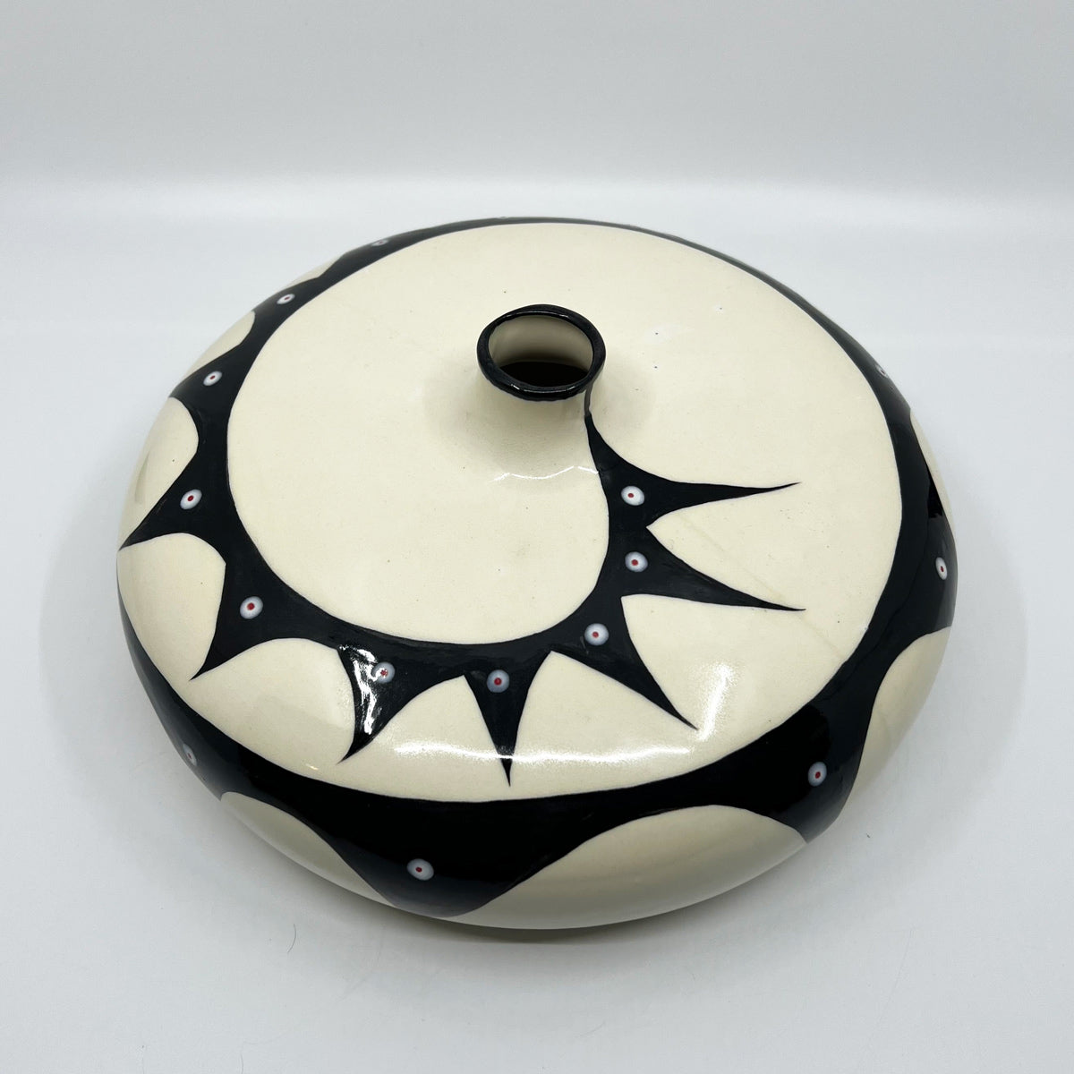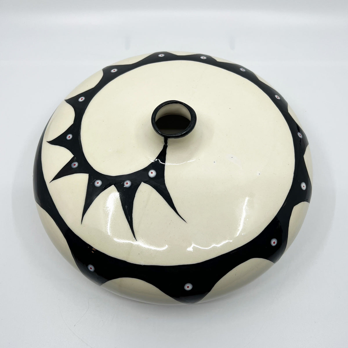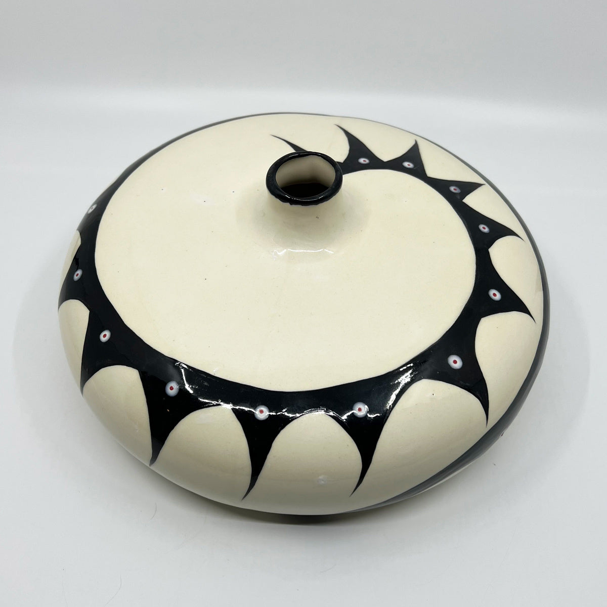 Veran’s Ceremonial Black Rim Pottery designs are original reflections of the rich heritage of North American Indian culture. The symbols represent harmony, balance and nature. Veran’s pottery pieces feature a black rim in honour of the ceremonial designs of his forefathers.