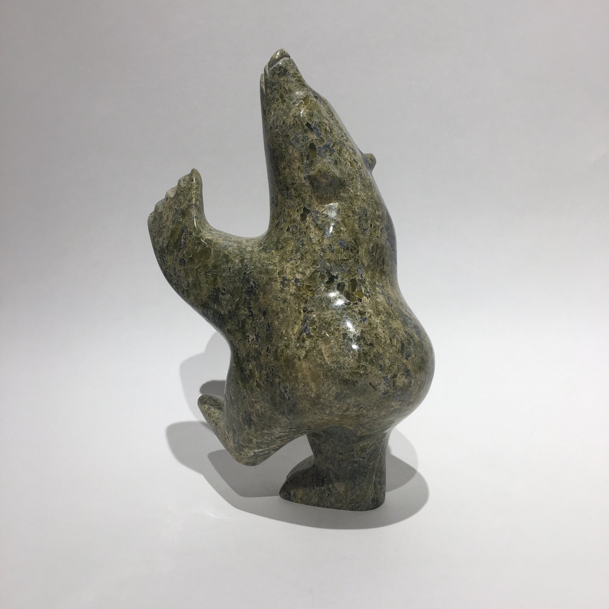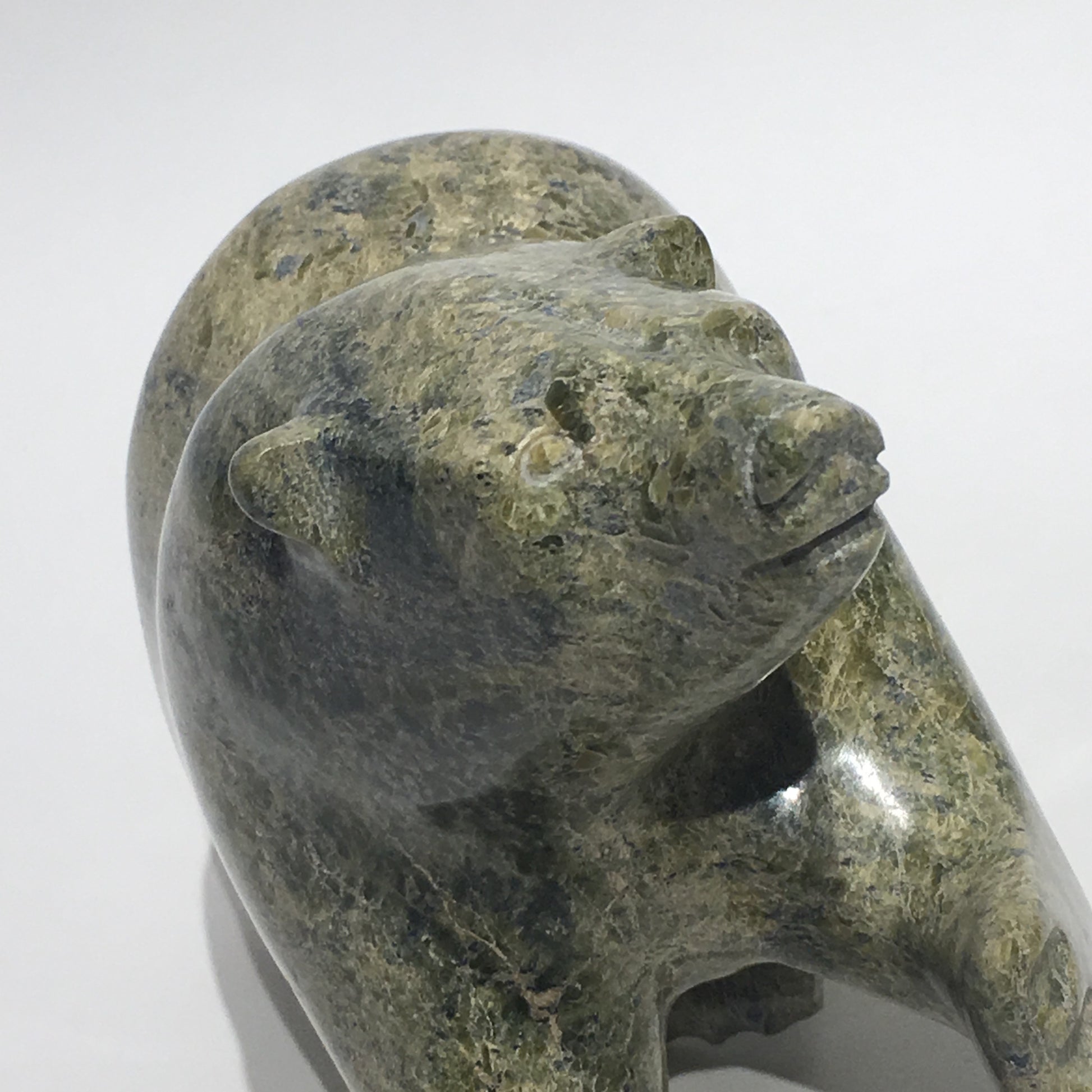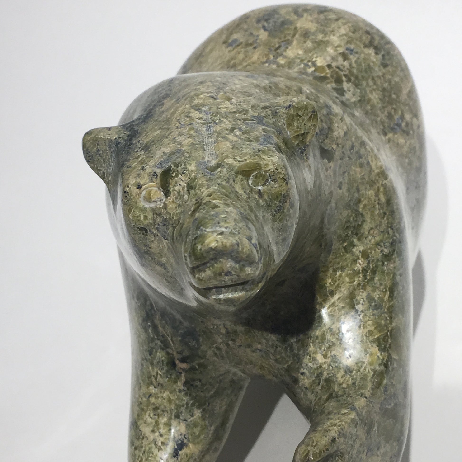 Joanie began carving Inukshuks at the age of 12, and by 14, he developed a passion for carving animals, with polar bears becoming his favorite subject. He attributes his traditional carving skills to the teachings of his older brother, Siutapik, and his grandfather, Inuk Munamie. Joanie skillfully sculpts with dark black or green serpentine stone from the Cape Dorset area, producing detailed and elegant works. Although he carves various wildlife, he has a particular preference for creating bears, often in large or medium sizes. His polar bears are realistically portrayed, capturing both their mass and movement with precision.