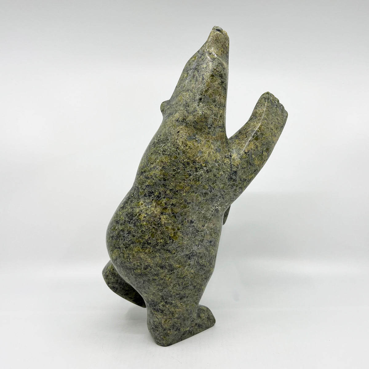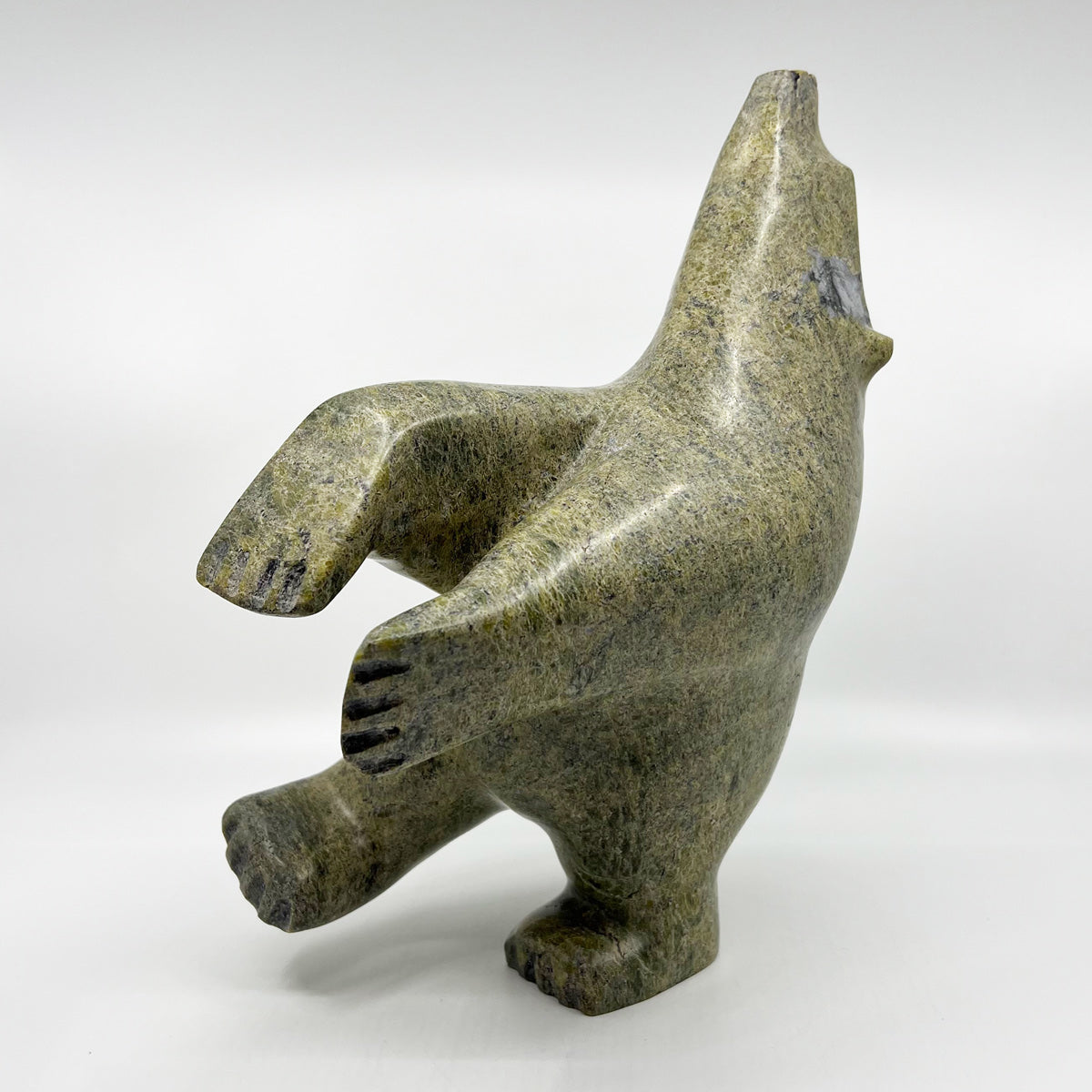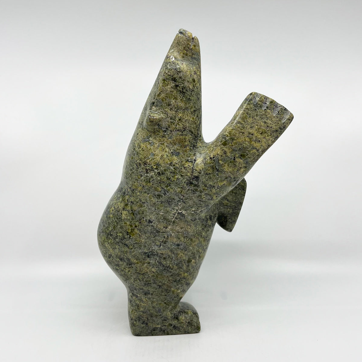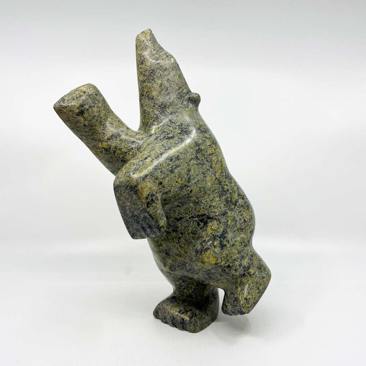 Joanie began carving Inukshuks at the age of 12, and by 14, he developed a passion for carving animals, with polar bears becoming his favorite subject. He attributes his traditional carving skills to the teachings of his older brother, Siutapik, and his grandfather, Inuk Munamie. Joanie skillfully sculpts with dark black or green serpentine stone from the Cape Dorset area, producing detailed and elegant works. Although he carves various wildlife, he has a particular preference for creating bears, often in large or medium sizes. His polar bears are realistically portrayed, capturing both their mass and movement with precision.