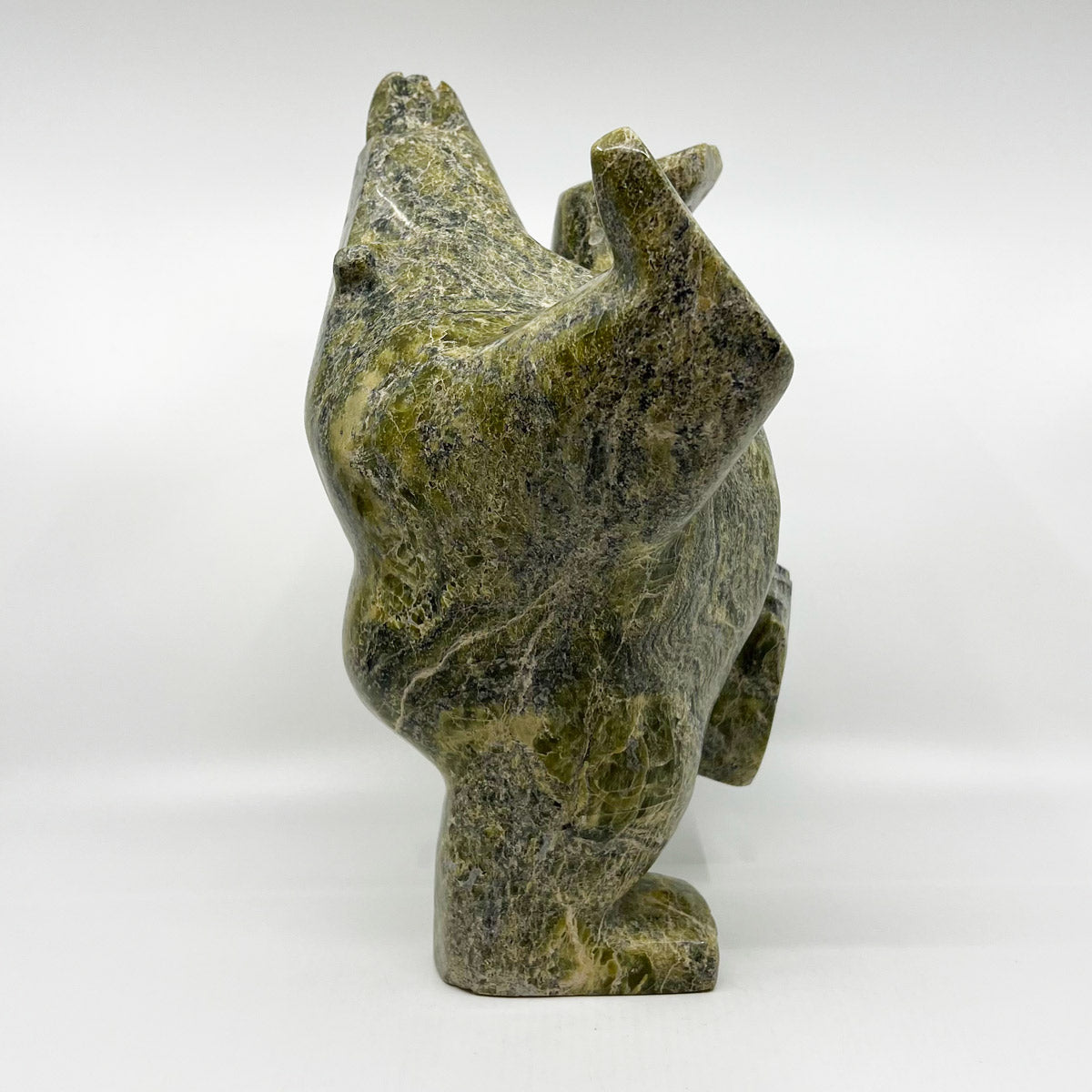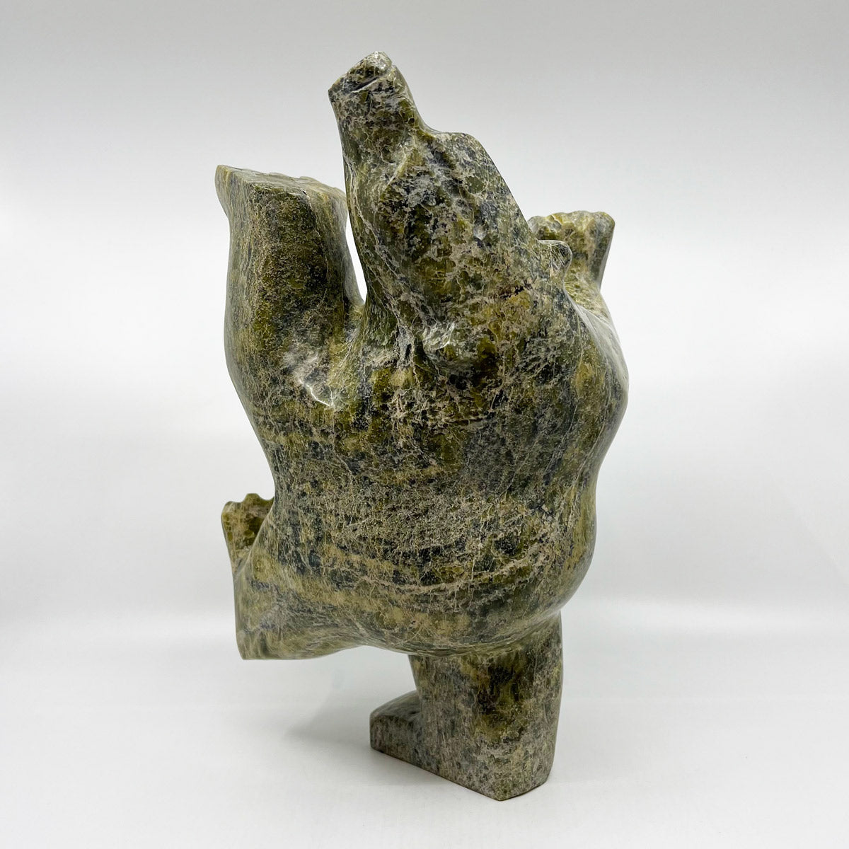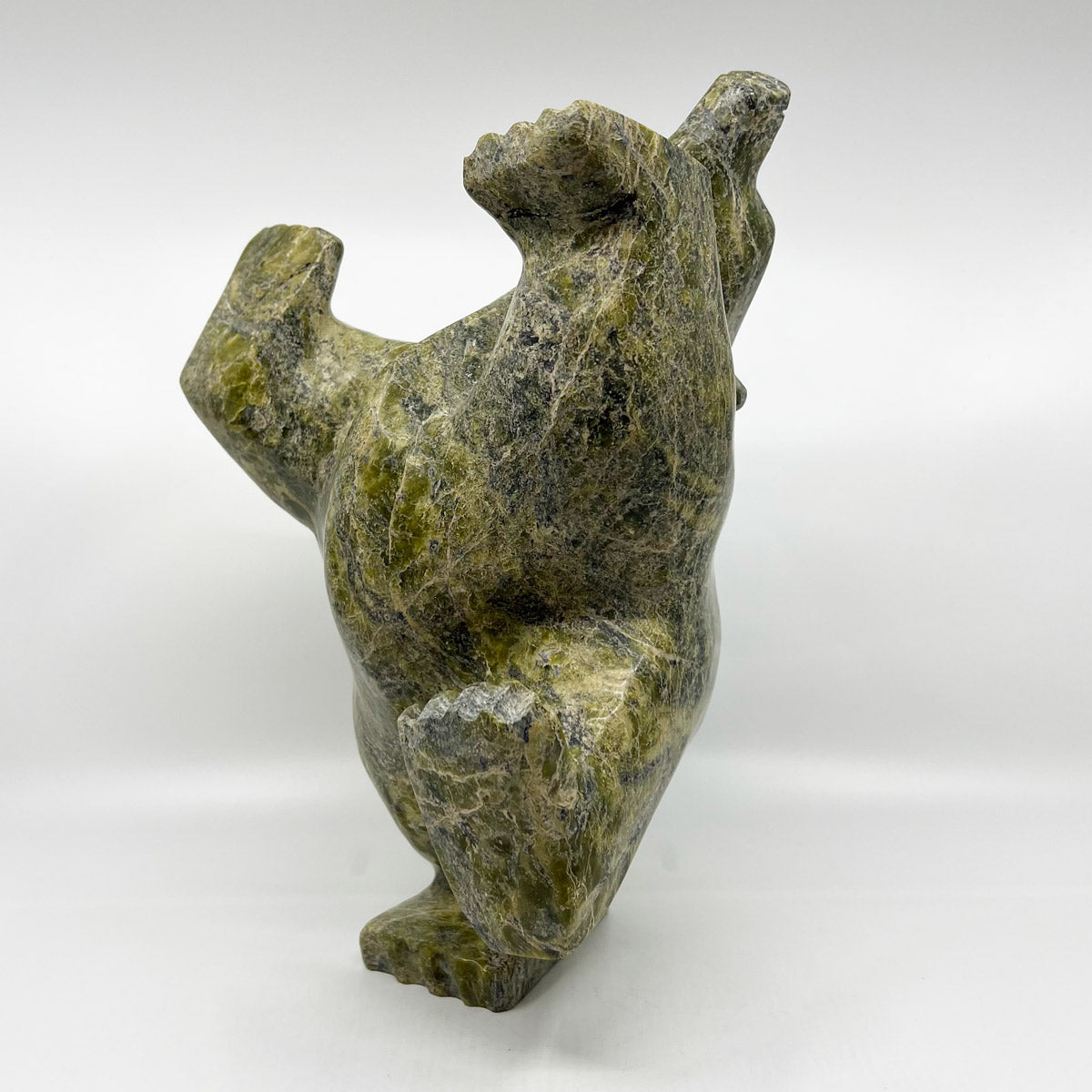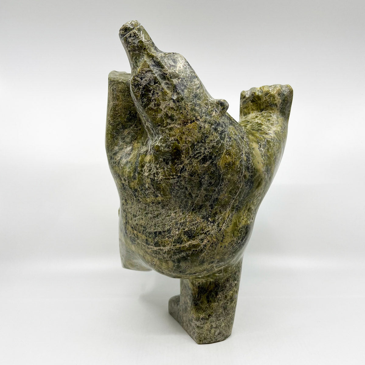 Joanie began carving Inukshuks at the age of 12, and by 14, he developed a passion for carving animals, with polar bears becoming his favorite subject. He attributes his traditional carving skills to the teachings of his older brother, Siutapik, and his grandfather, Inuk Munamie. Joanie skillfully sculpts with dark black or green serpentine stone from the Cape Dorset area, producing detailed and elegant works. Although he carves various wildlife, he has a particular preference for creating bears, often in large or medium sizes. His polar bears are realistically portrayed, capturing both their mass and movement with precision.