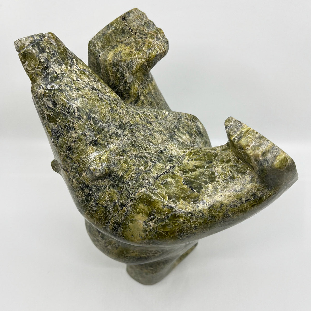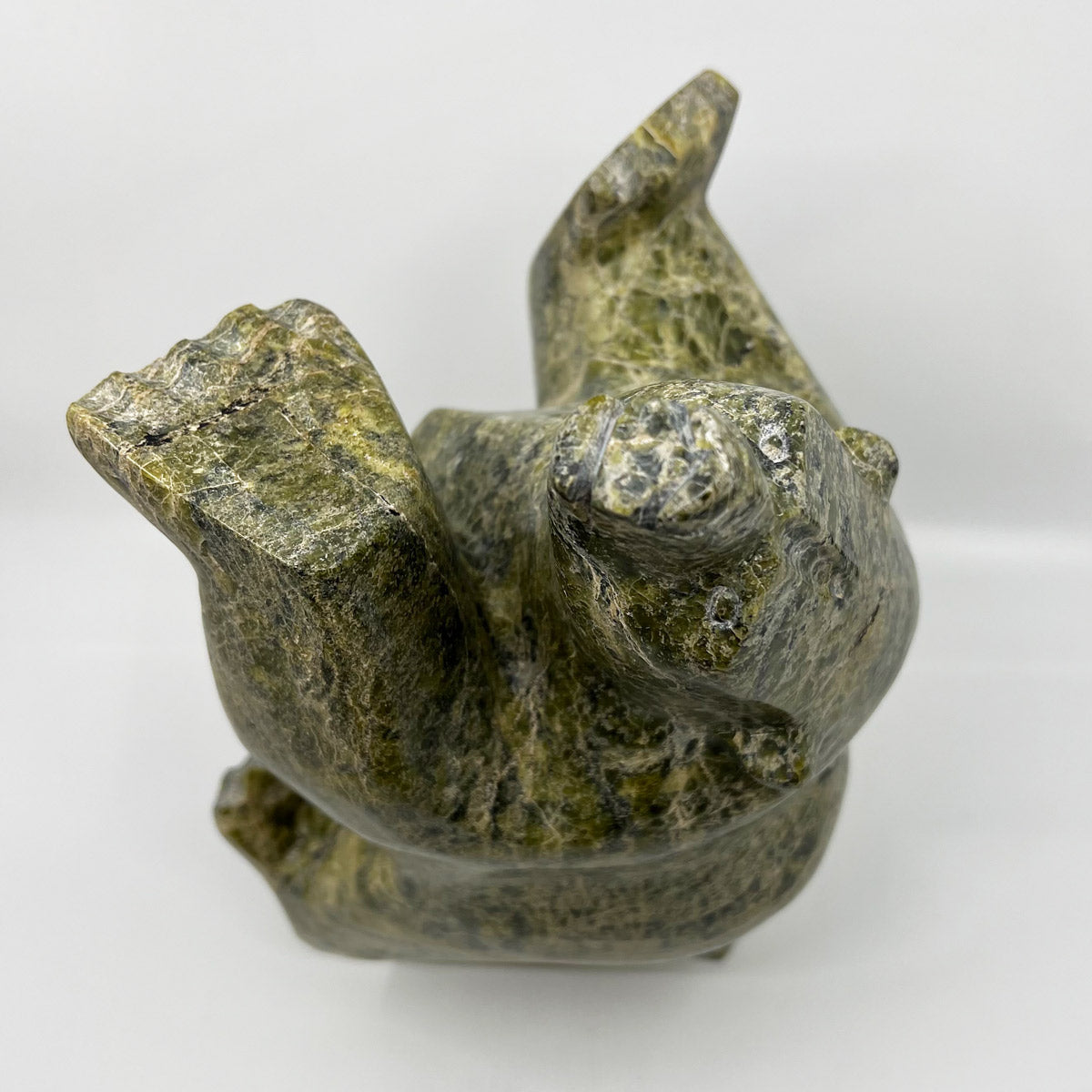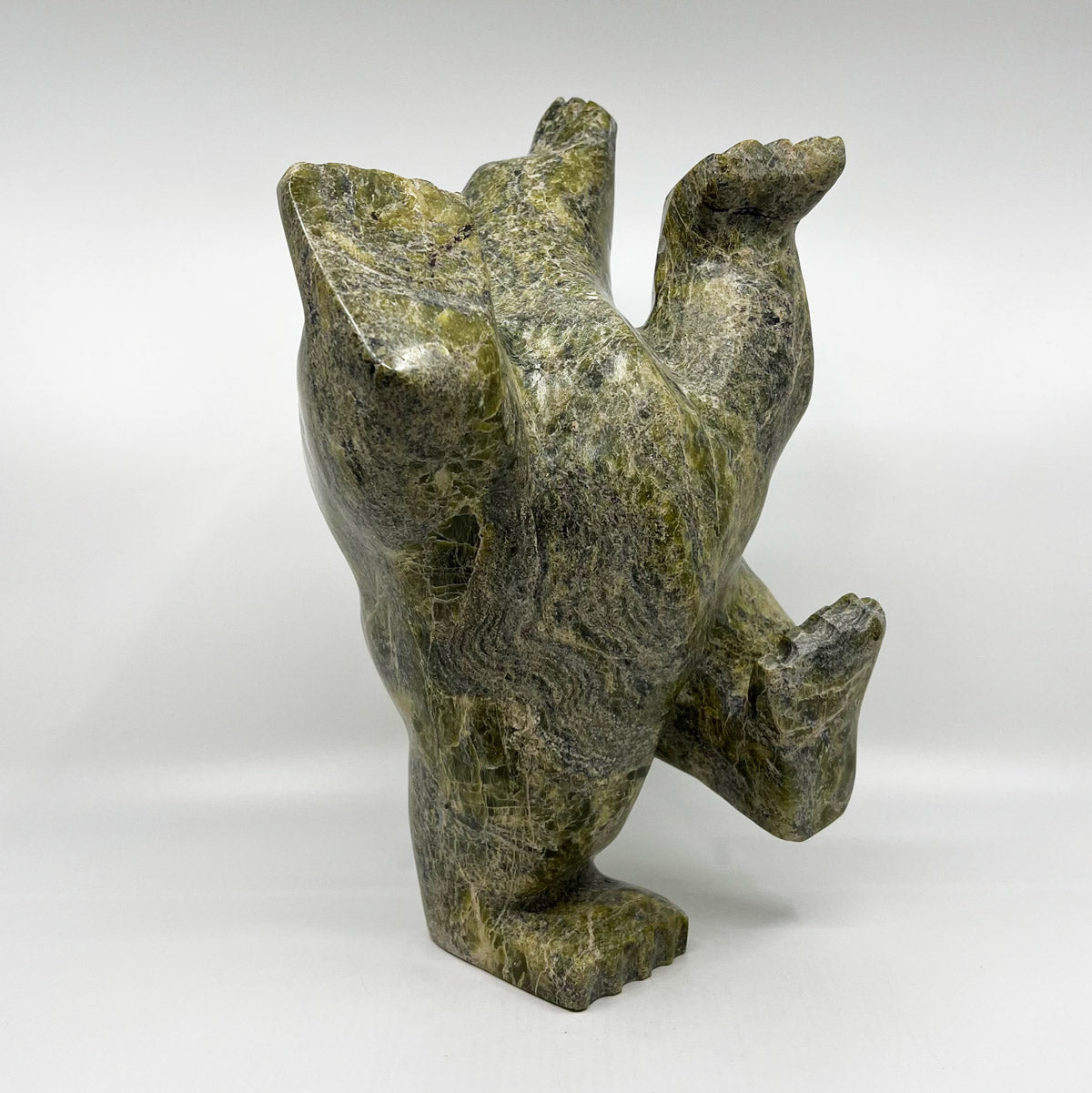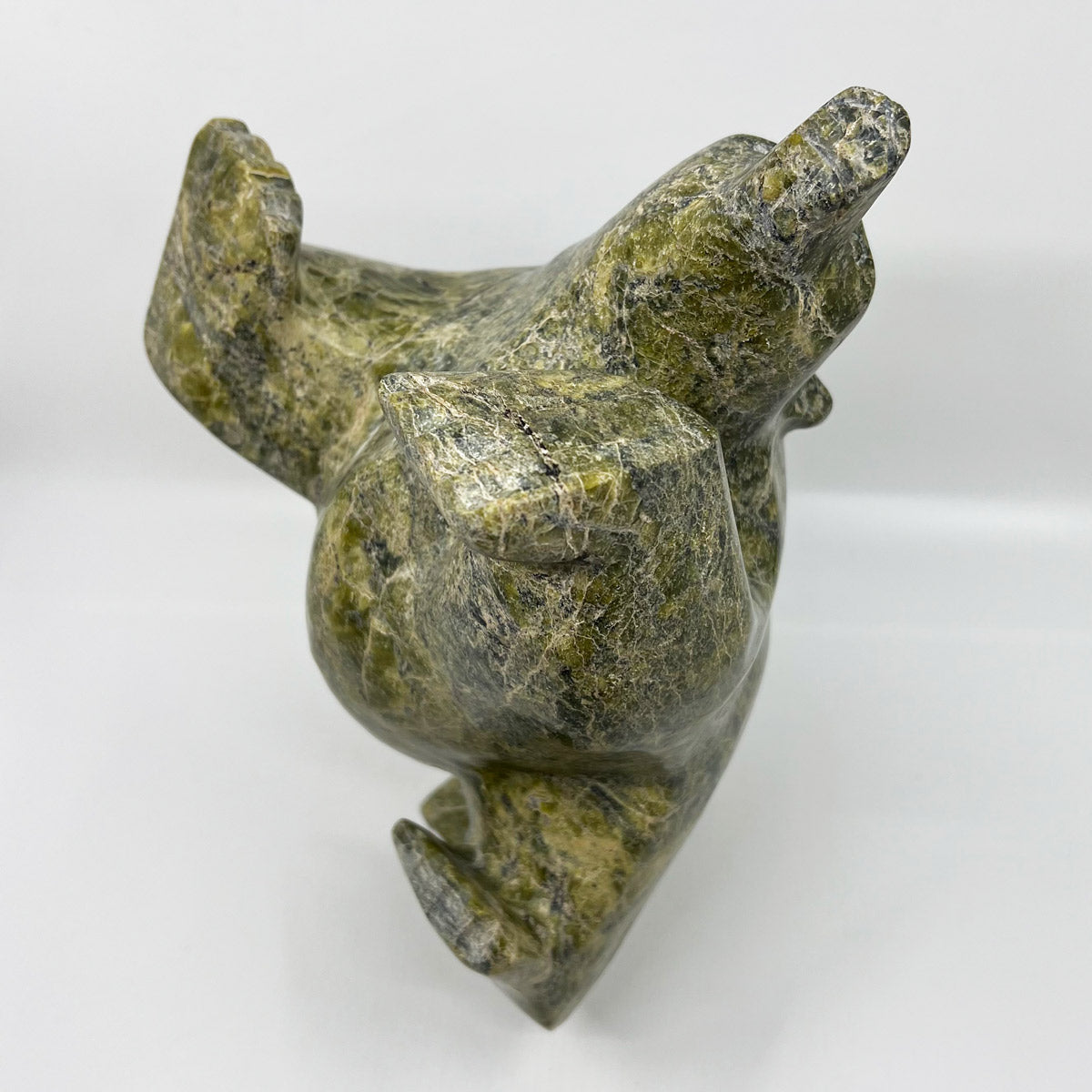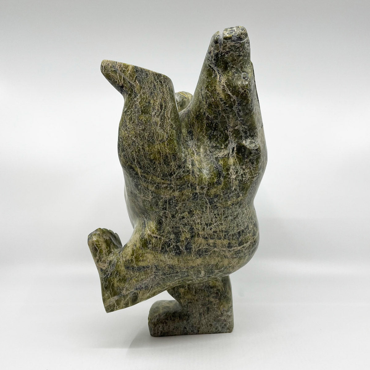 Joanie began carving Inukshuks at the age of 12, and by 14, he developed a passion for carving animals, with polar bears becoming his favorite subject. He attributes his traditional carving skills to the teachings of his older brother, Siutapik, and his grandfather, Inuk Munamie. Joanie skillfully sculpts with dark black or green serpentine stone from the Cape Dorset area, producing detailed and elegant works. Although he carves various wildlife, he has a particular preference for creating bears, often in large or medium sizes. His polar bears are realistically portrayed, capturing both their mass and movement with precision.