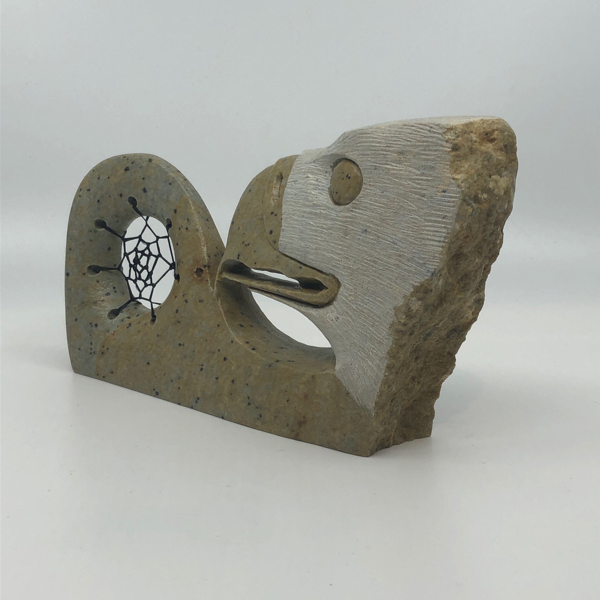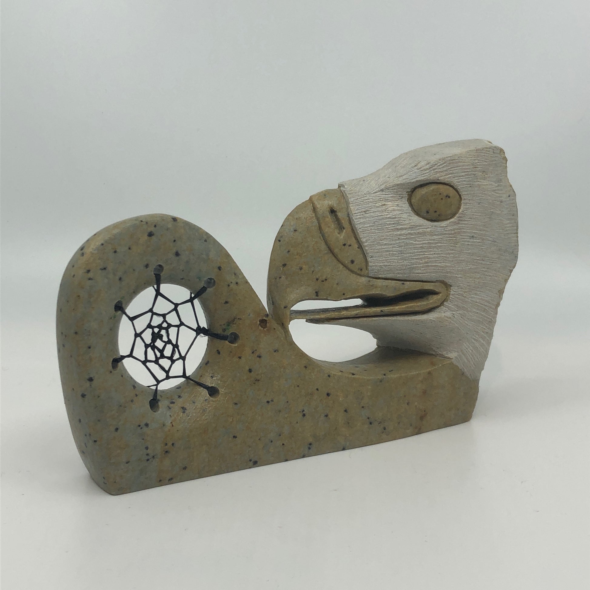 As a self-taught artist, Longboat’s medium of choice is primarily Brazilian soapstone. His sculptures are renowned for their intricate detail and the way they embody the spirit of his people. Longboat’s works typically focus on symbols and figures central to his culture, such as the eagle, turtle, and wolf, reflecting his deep connection to his ancestry and the natural world.