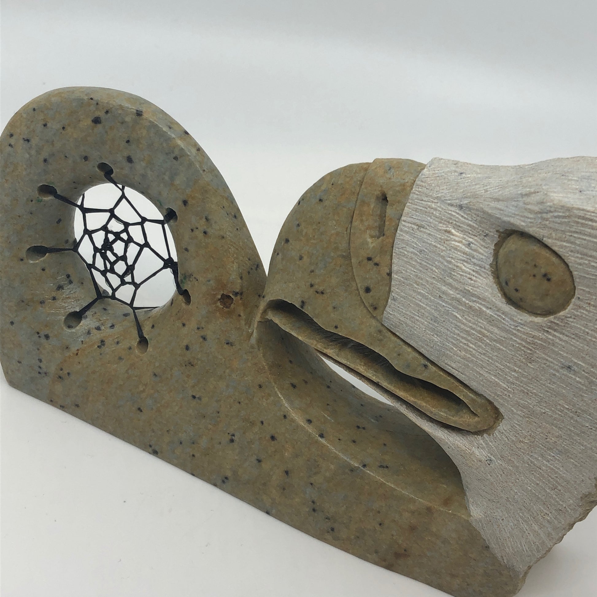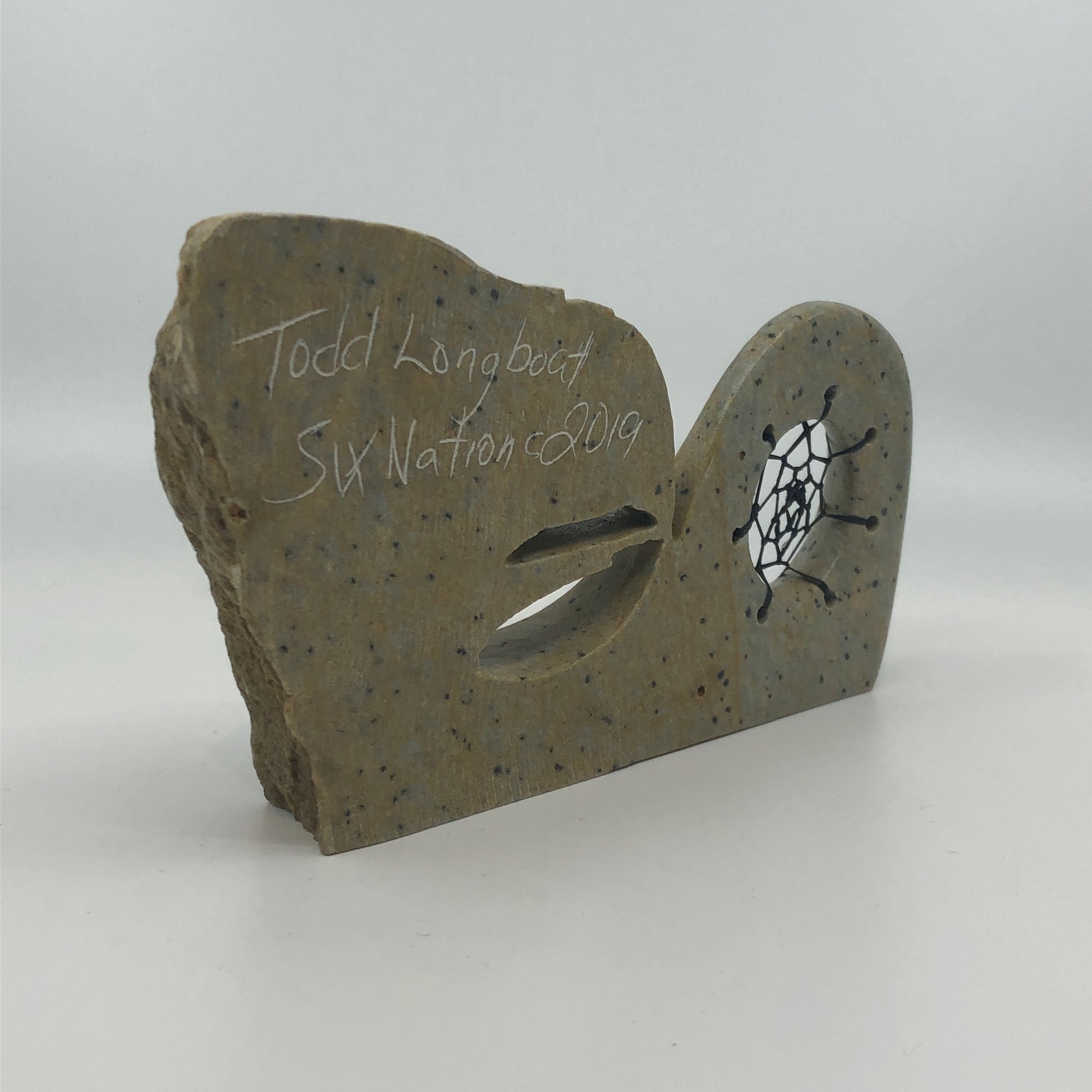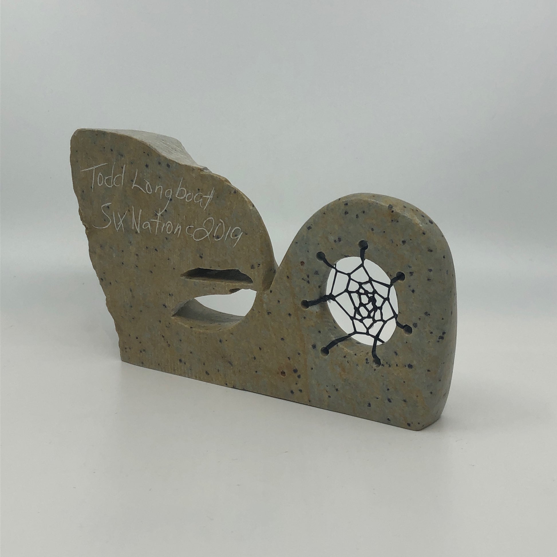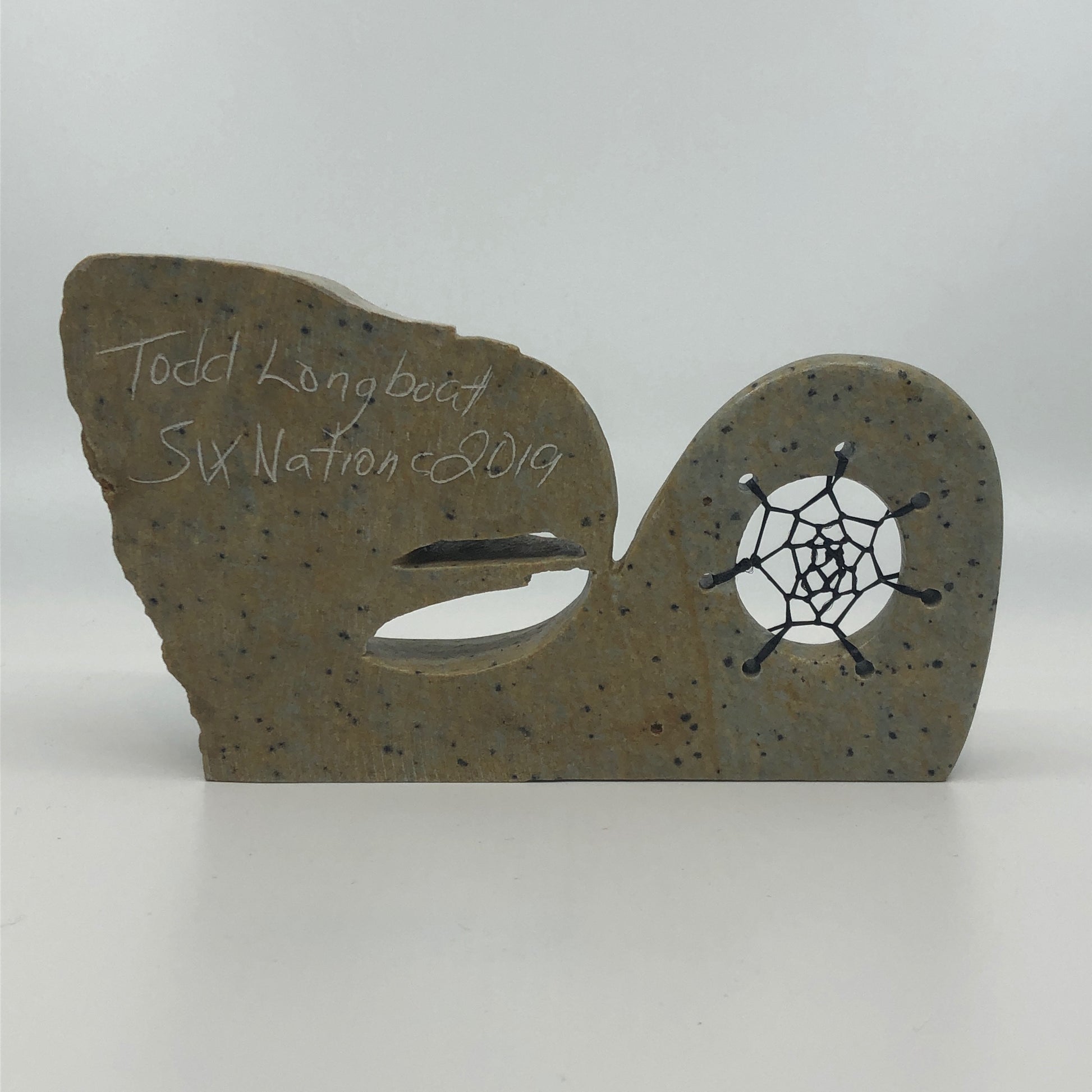 Todd Longboat, born in 1978 on the Six Nations Reserve in Ontario, Canada, is a highly regarded Indigenous artist known for his soapstone carvings. A member of the Wolf Clan of the Onondaga Nation, Longboat began his artistic journey at the age of 11, learning by observing his parents and older brother, both of whom were carvers. His work is deeply influenced by his cultural heritage, often depicting animals like wolves and eagles, which hold significant meaning within the clan systems of the Six Nations. His grandfather, Chief Jacob Thomas, was also a notable carver, further enriching Todd’s artistic lineage.