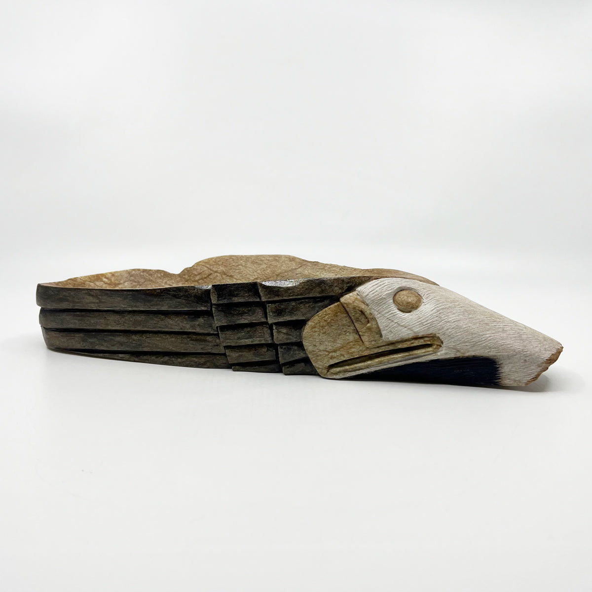 Todd Longboat, born in 1978 on the Six Nations Reserve in Ontario, Canada, is a highly regarded Indigenous artist known for his soapstone carvings. A member of the Wolf Clan of the Onondaga Nation, Longboat began his artistic journey at the age of 11, learning by observing his parents and older brother, both of whom were carvers. His work is deeply influenced by his cultural heritage, often depicting animals like wolves and eagles, which hold significant meaning within the clan systems of the Six Nations. His grandfather, Chief Jacob Thomas, was also a notable carver, further enriching Todd’s artistic lineage.