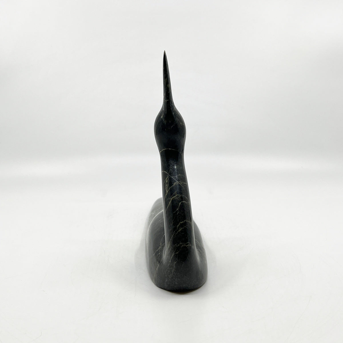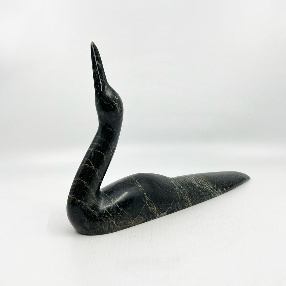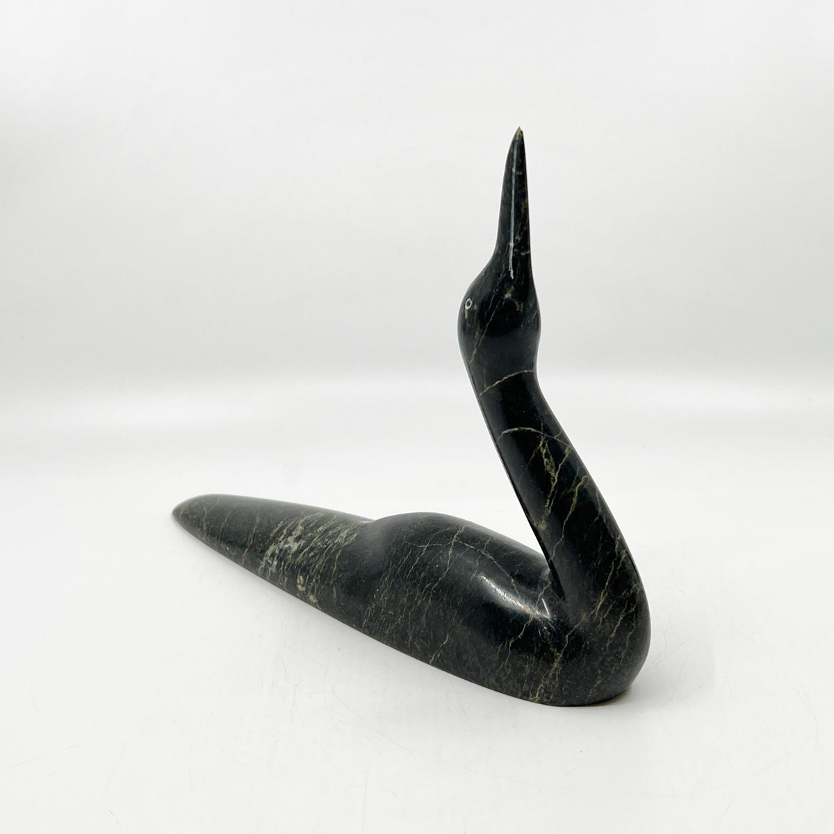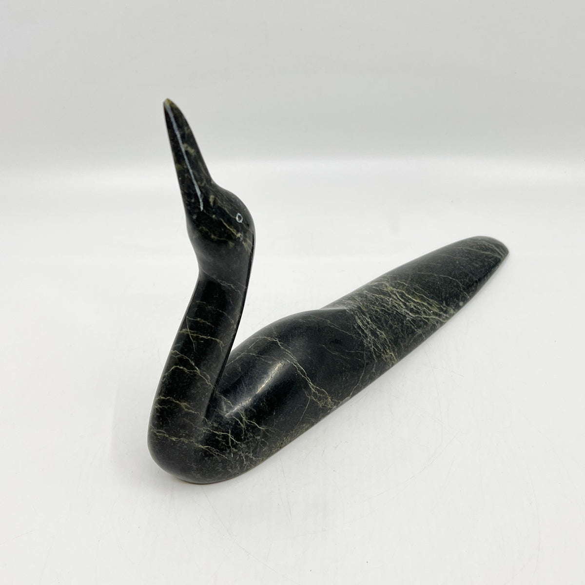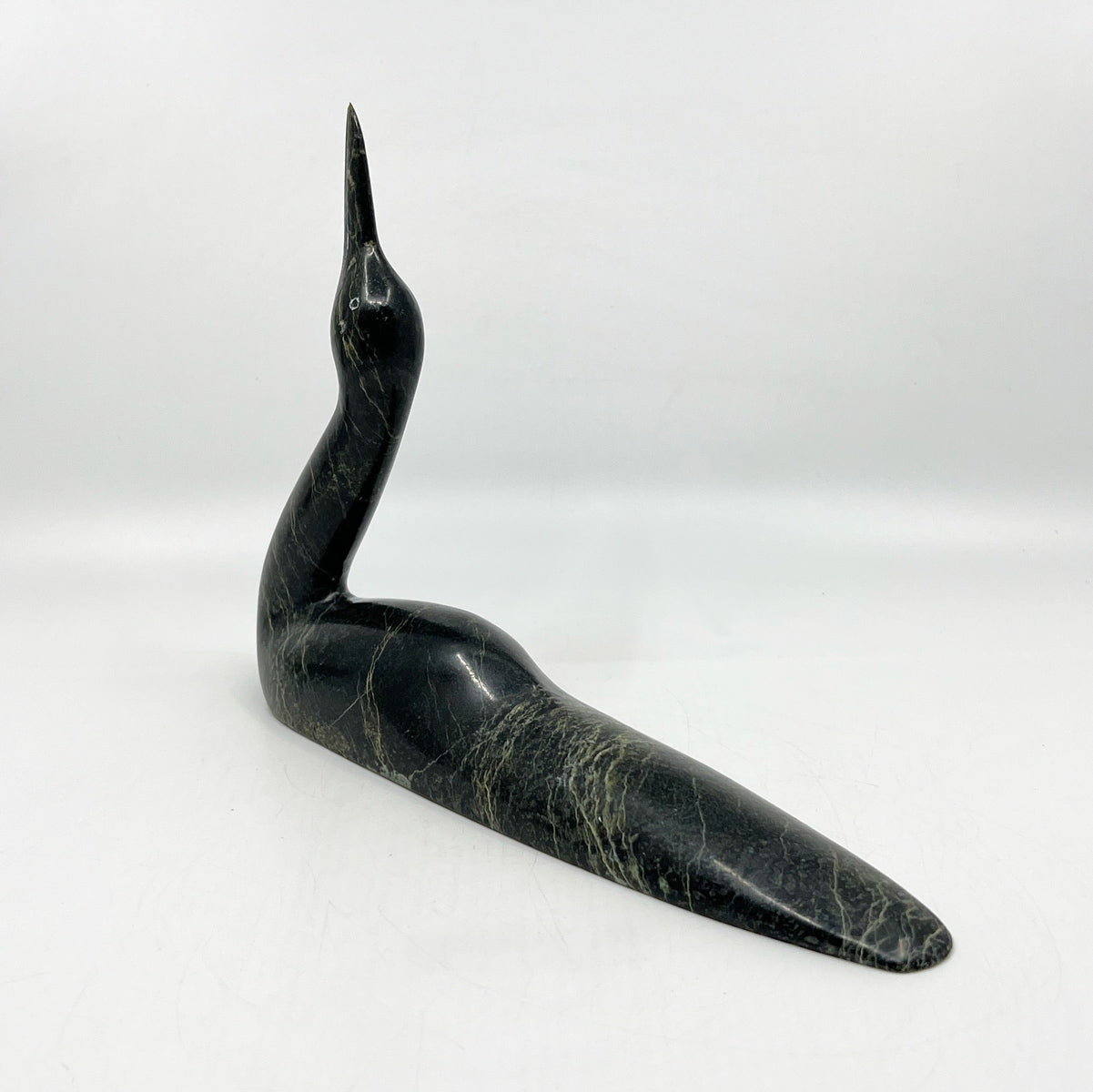 Ningeosiak is one of Kinngait’s only full-time female carvers, using both manual and power tools to carve delicate forms out of serpentine and stone. She finishes each of her sculptures off with a high shine to further accentuate their grace and elegance. Ningeosiak has participated in numerous exhibitions across Canada and internationally, and her work represented in major public collections such as the National Gallery of Canada.