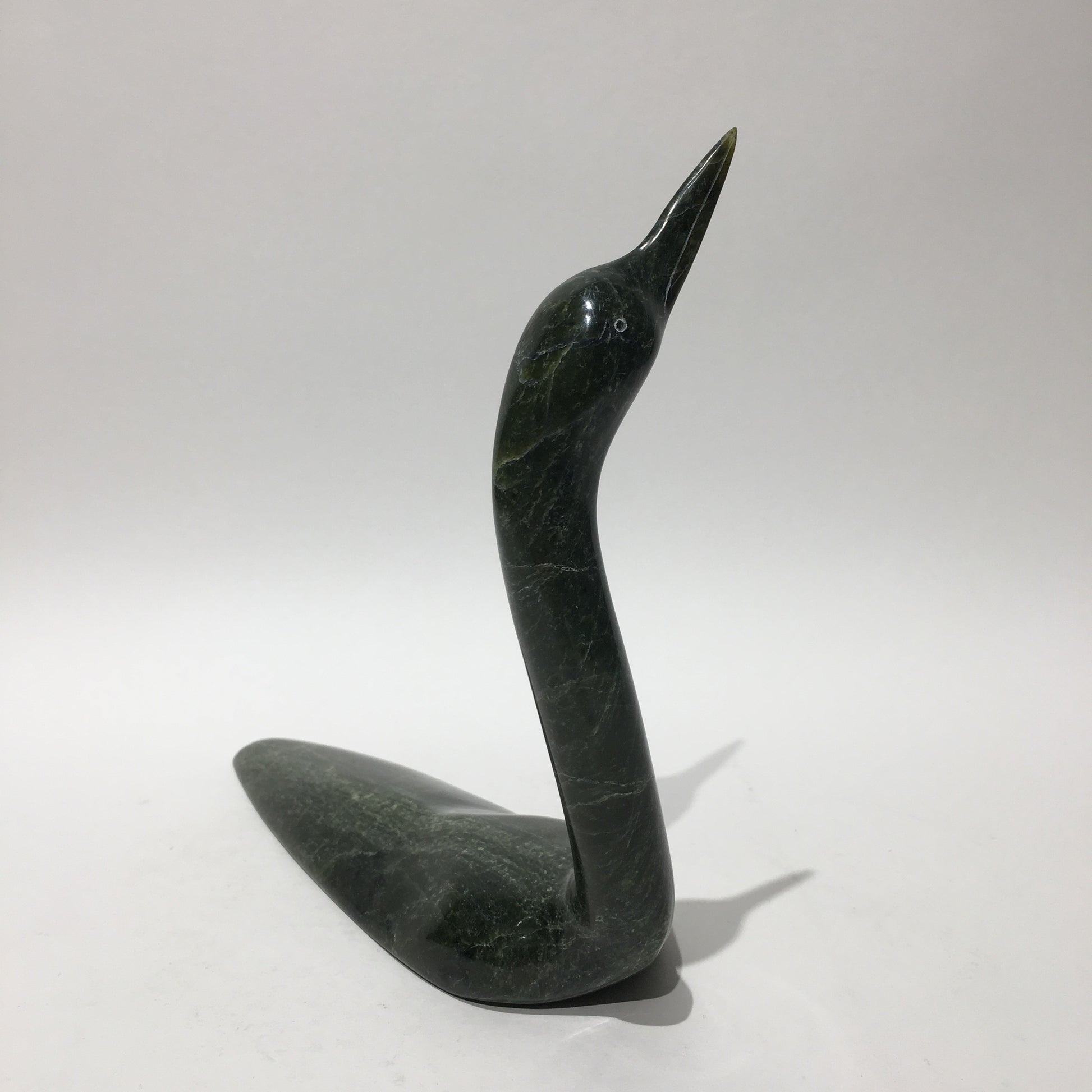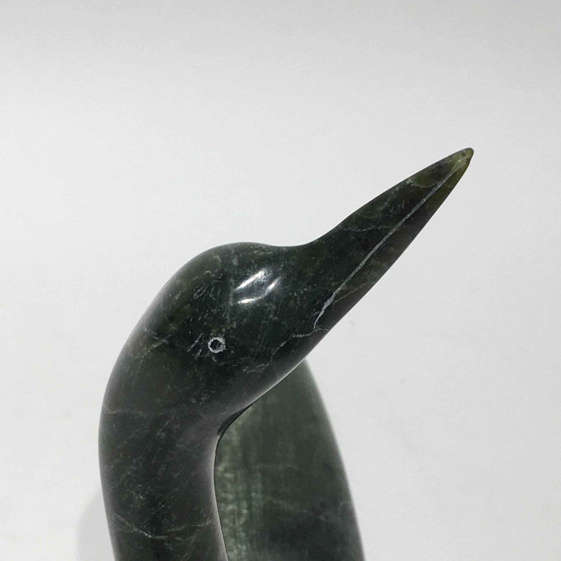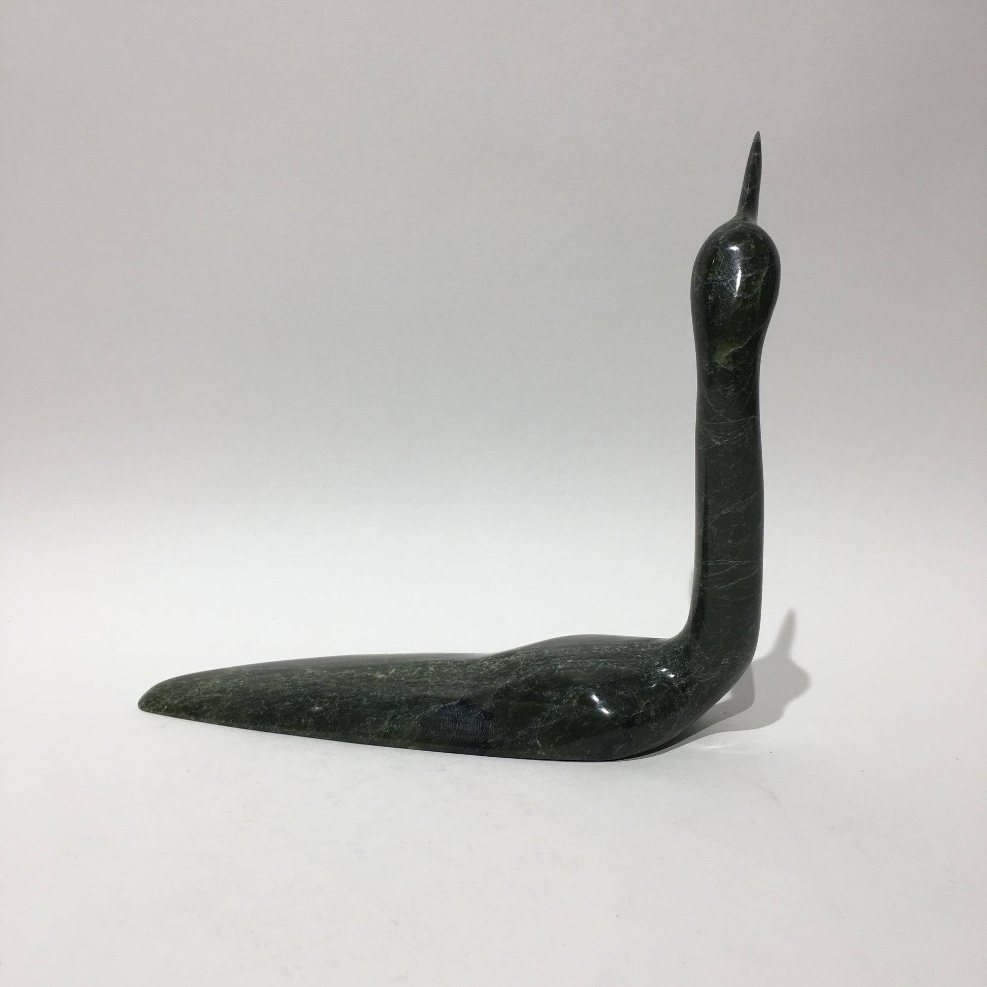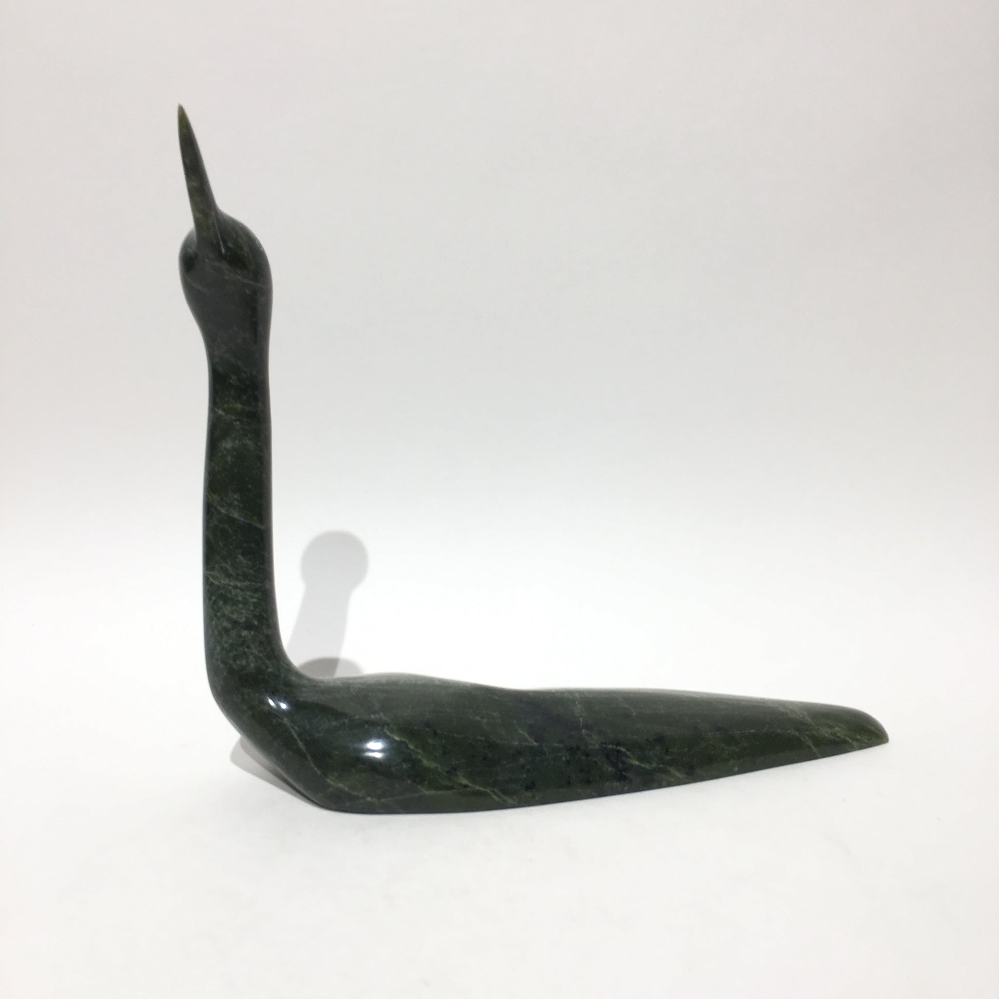 Ningeosiak is one of Kinngait’s only full-time female carvers, using both manual and power tools to carve delicate forms out of serpentine and stone. She finishes each of her sculptures off with a high shine to further accentuate their grace and elegance. Ningeosiak has participated in numerous exhibitions across Canada and internationally, and her work represented in major public collections such as the National Gallery of Canada.