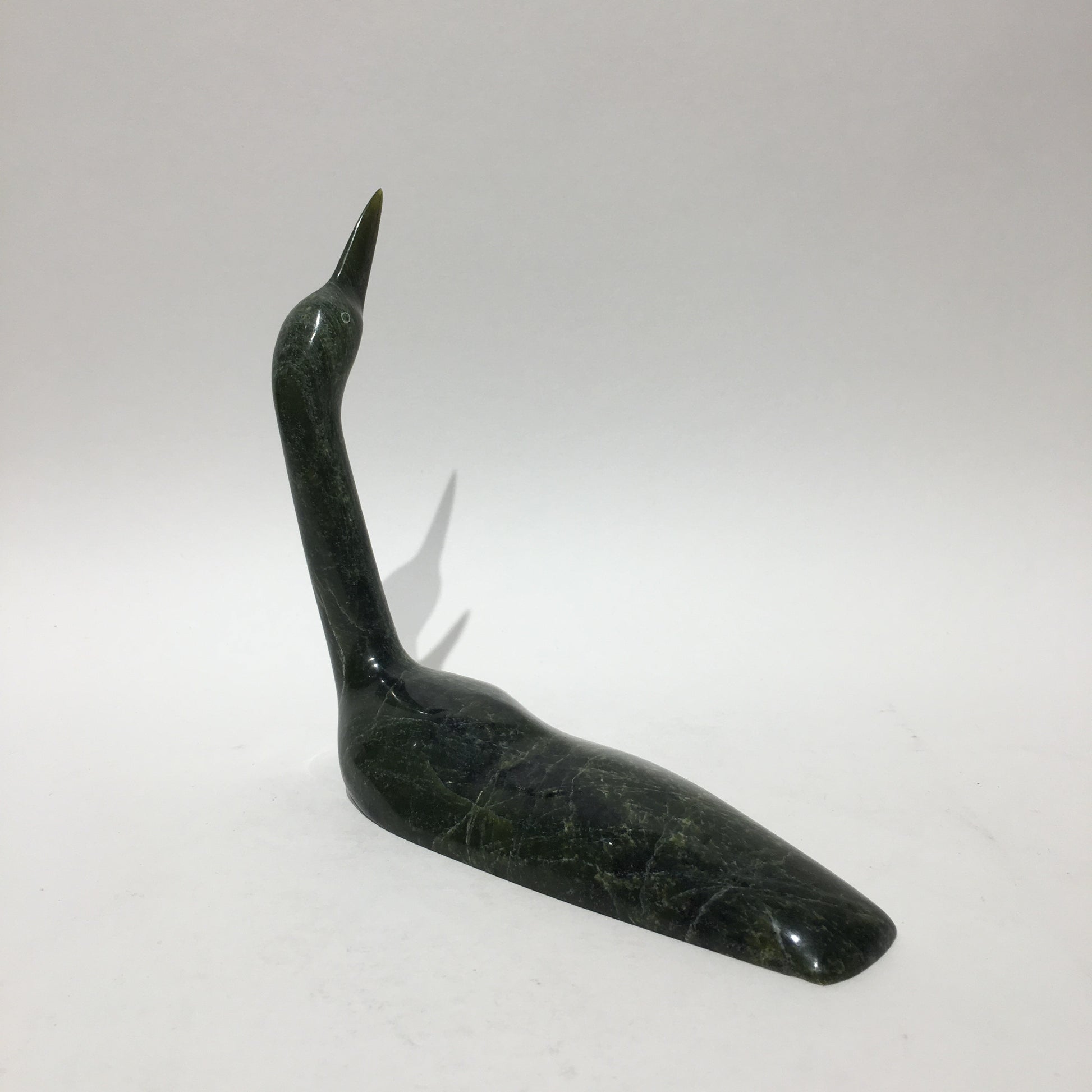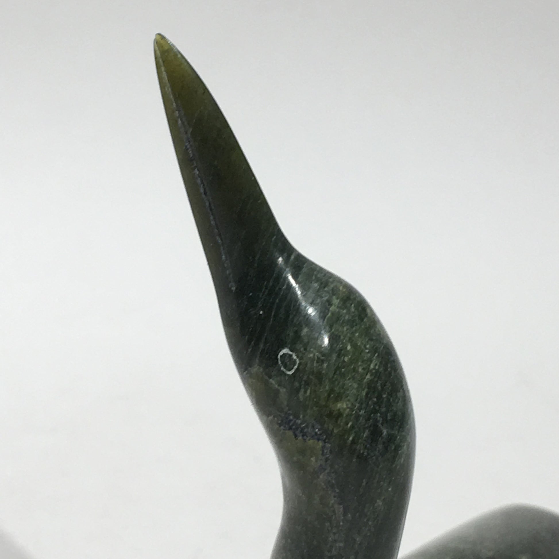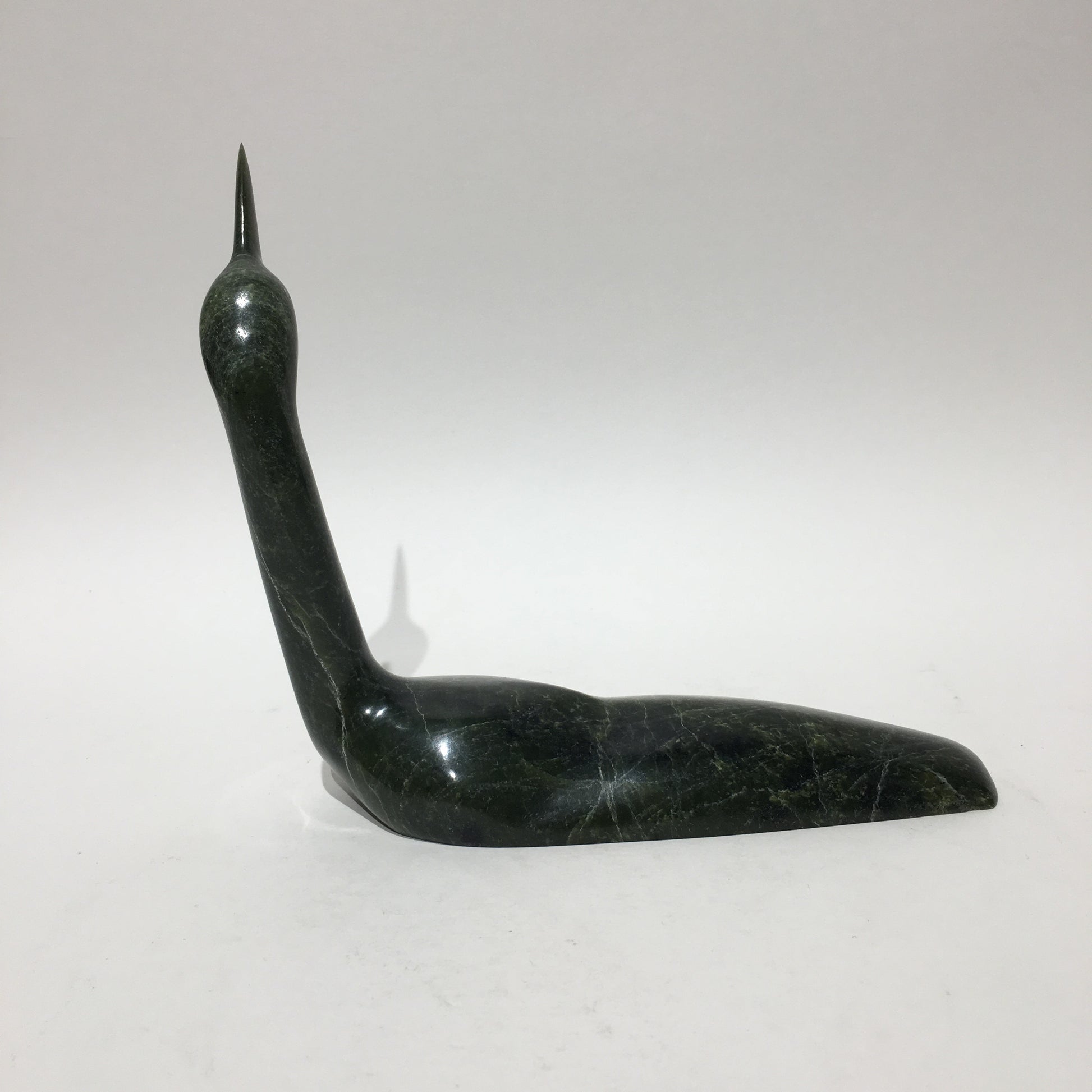 Ningeosiak is one of Kinngait’s only full-time female carvers, using both manual and power tools to carve delicate forms out of serpentine and stone. She finishes each of her sculptures off with a high shine to further accentuate their grace and elegance. Ningeosiak has participated in numerous exhibitions across Canada and internationally, and her work represented in major public collections such as the National Gallery of Canada.