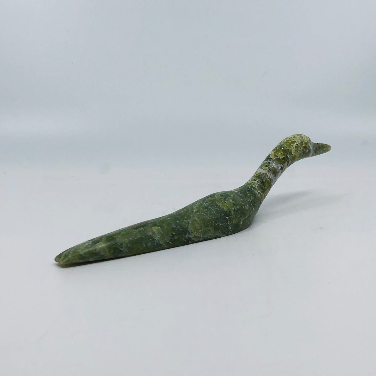 Ningeosiak is one of Kinngait’s only full-time female carvers, using both manual and power tools to carve delicate forms out of serpentine and stone. She finishes each of her sculptures off with a high shine to further accentuate their grace and elegance. Ningeosiak has participated in numerous exhibitions across Canada and internationally, and her work represented in major public collections such as the National Gallery of Canada.
