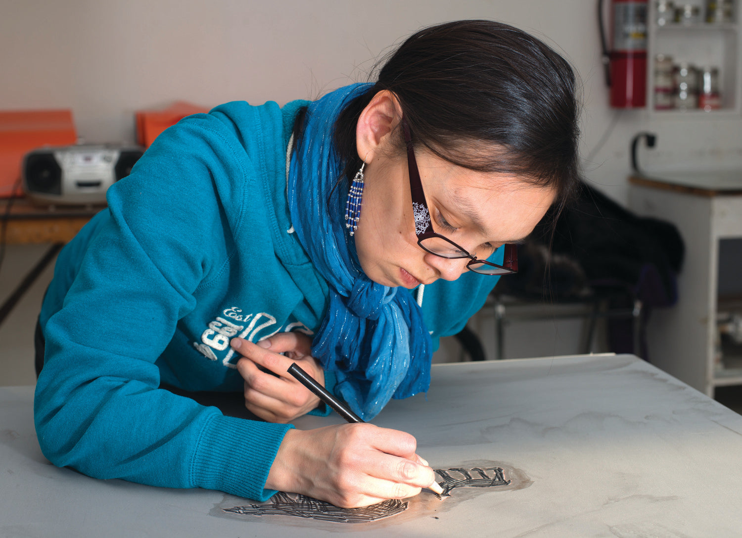 Saimaiyu Akesuk was born on April 28, 1988 in Iqaluit but she has lived in Cape Dorset her whole life. Her parents are Lau Akesuk and Olayuk Akesuk who was one of the first Members of the Legislative Assembly in Nunavut. Saimaiyu was inspired to start drawing by Ningiukulu Teevee while they were taking a class together at the Nunavut Teaching Education Program. Saimaiyu’s confident drawings of birds and bears are characterized by her bold and dynamic simplicity rendered with soft tenderness and quite often a touch of whimsy.