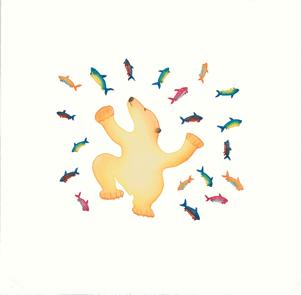 Cee initially began his artistic journey as a carver in the 1990s, creating detailed depictions of spirits and transformative figures. However, in 2009, he transitioned into printmaking, where he quickly excelled. His prints are known for their intricate design and dynamic movement, such as in his notable work School of Fish (2015). Cee’s art captures both traditional Inuit themes and daily community life.