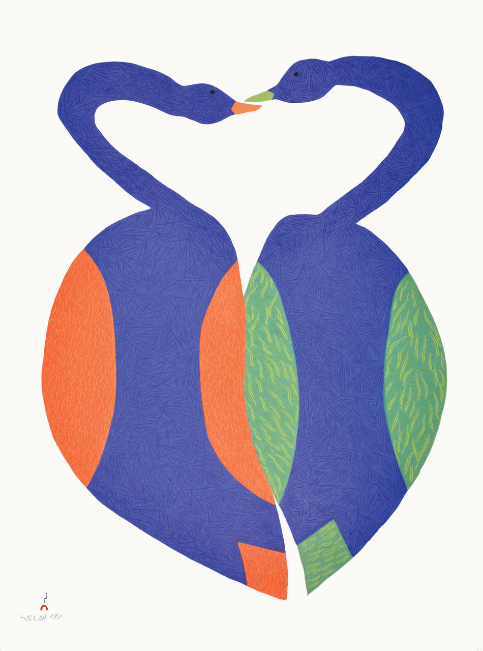 Saimaiyu Akesuk was born on April 28, 1988 in Iqaluit but she has lived in Cape Dorset her whole life. Her parents are Lau Akesuk and Olayuk Akesuk who was one of the first Members of the Legislative Assembly in Nunavut. Saimaiyu was inspired to start drawing by Ningiukulu Teevee while they were taking a class together at the Nunavut Teaching Education Program. Saimaiyu’s confident drawings of birds and bears are characterized by her bold and dynamic simplicity rendered with soft tenderness and quite often a touch of whimsy.