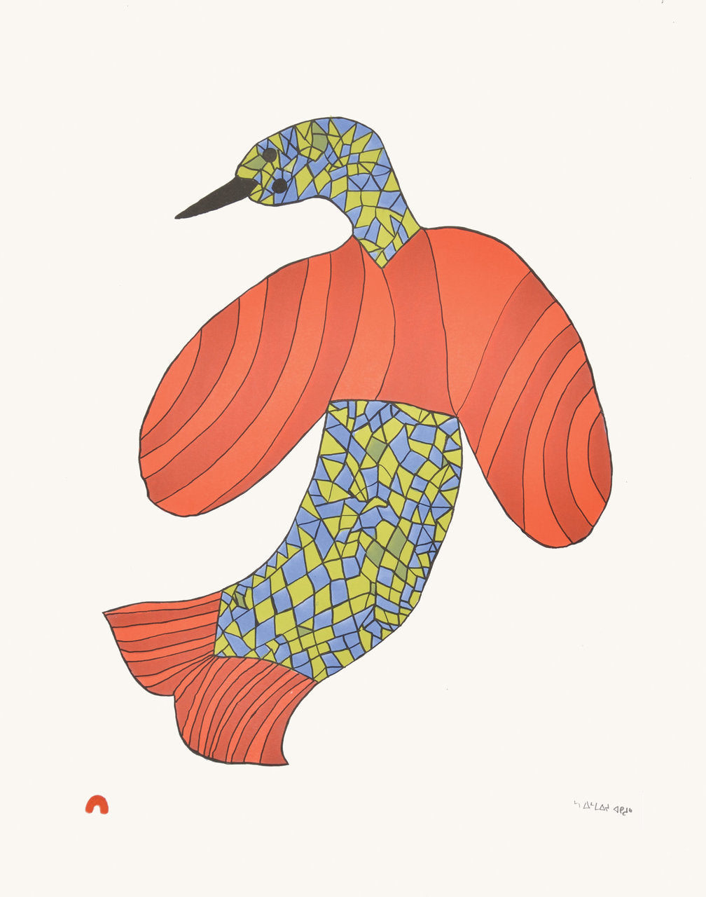 Saimaiyu Akesuk was born on April 28, 1988 in Iqaluit but she has lived in Cape Dorset her whole life. Her parents are Lau Akesuk and Olayuk Akesuk who was one of the first Members of the Legislative Assembly in Nunavut. Saimaiyu was inspired to start drawing by Ningiukulu Teevee while they were taking a class together at the Nunavut Teaching Education Program. Saimaiyu’s confident drawings of birds and bears are characterized by her bold and dynamic simplicity rendered with soft tenderness and quite often a touch of whimsy.