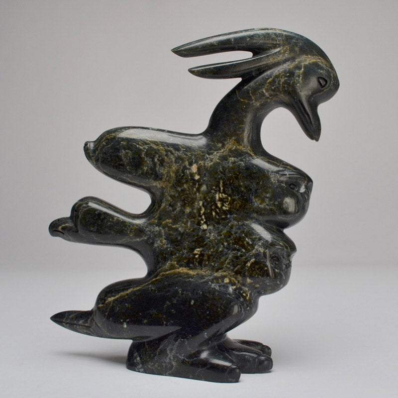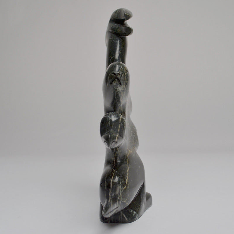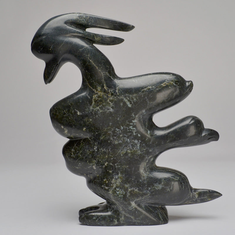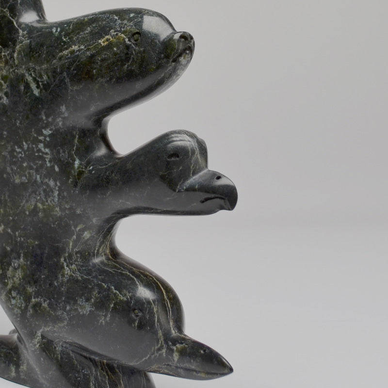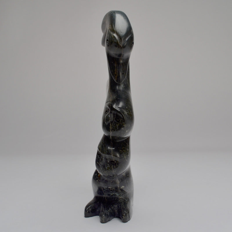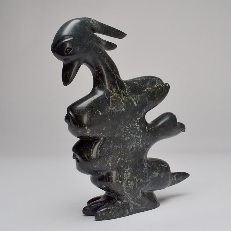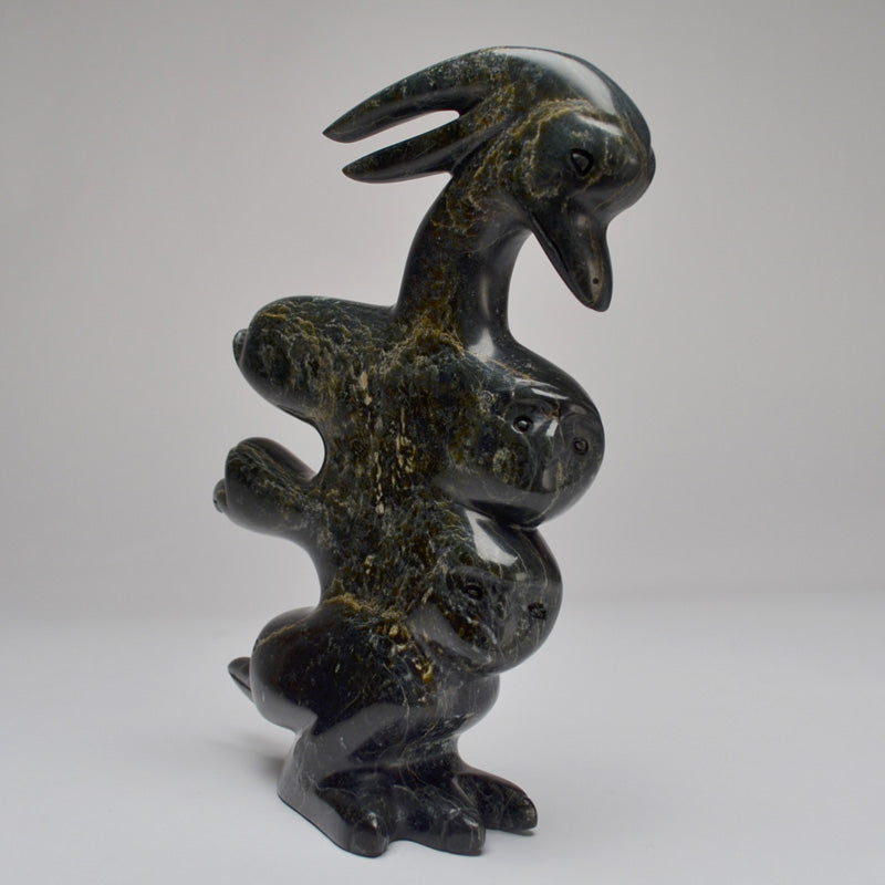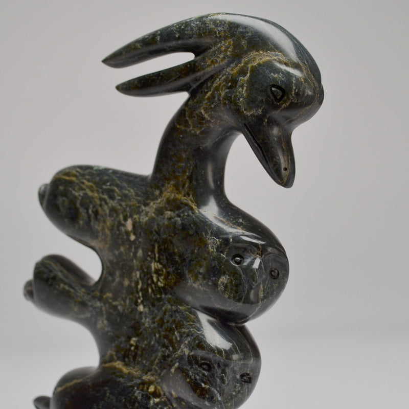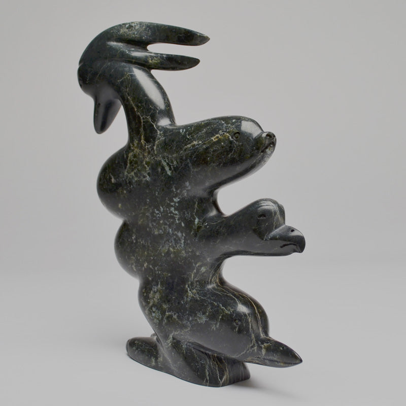 Ningeosiak is one of Kinngait’s only full-time female carvers, using both manual and power tools to carve delicate forms out of serpentine and stone. She finishes each of her sculptures off with a high shine to further accentuate their grace and elegance. Ningeosiak has participated in numerous exhibitions across Canada and internationally, and her work represented in major public collections such as the National Gallery of Canada.