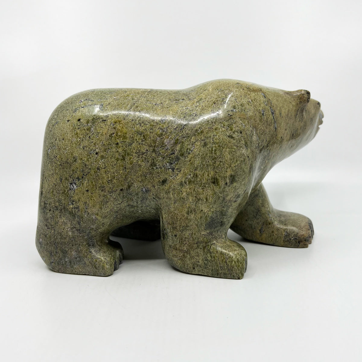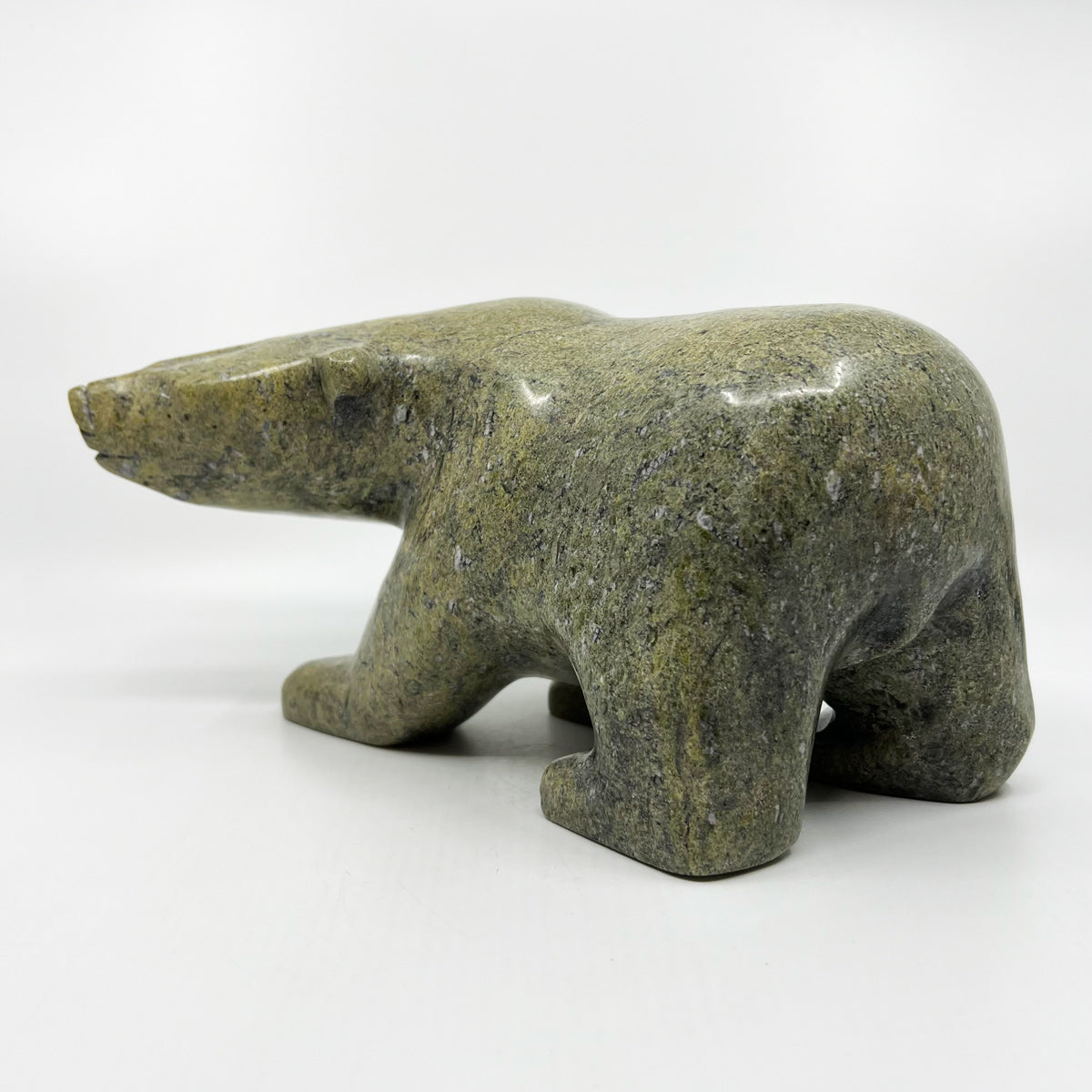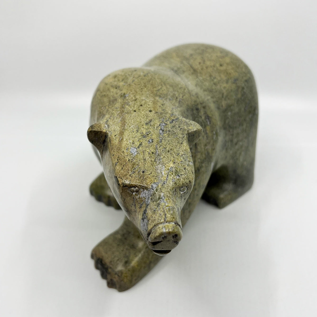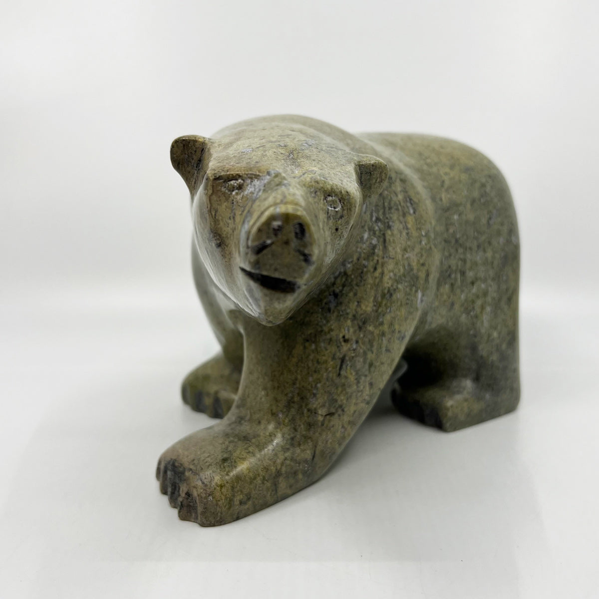 Joanie began carving Inukshuks at the age of 12, and by 14, he developed a passion for carving animals, with polar bears becoming his favorite subject. He attributes his traditional carving skills to the teachings of his older brother, Siutapik, and his grandfather, Inuk Munamie. Joanie skillfully sculpts with dark black or green serpentine stone from the Cape Dorset area, producing detailed and elegant works. Although he carves various wildlife, he has a particular preference for creating bears, often in large or medium sizes. His polar bears are realistically portrayed, capturing both their mass and movement with precision.