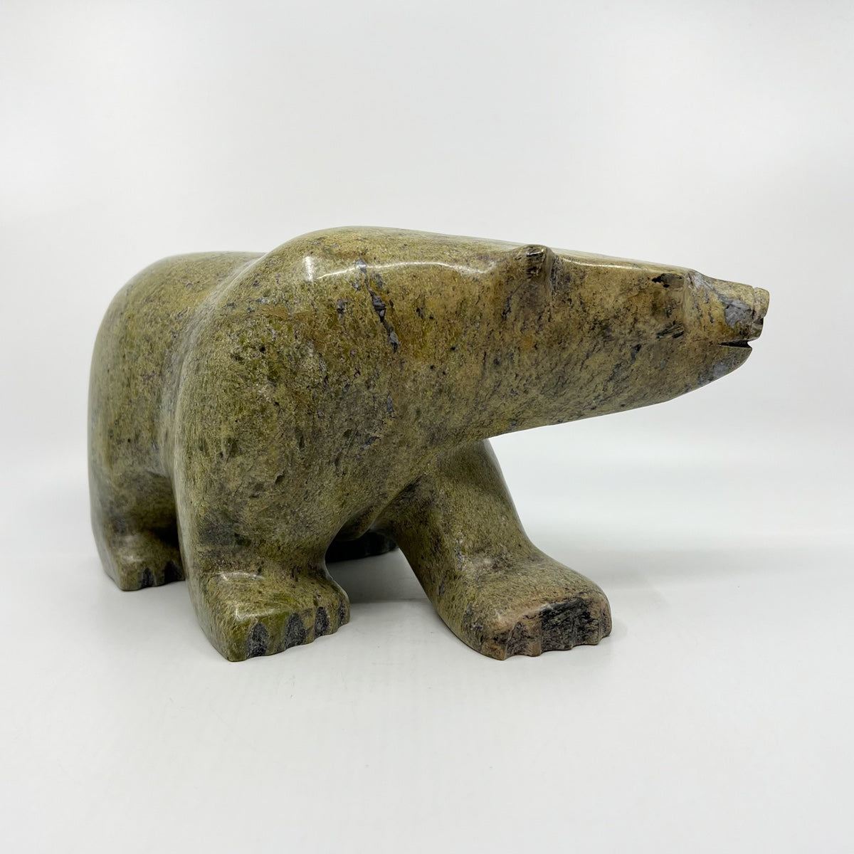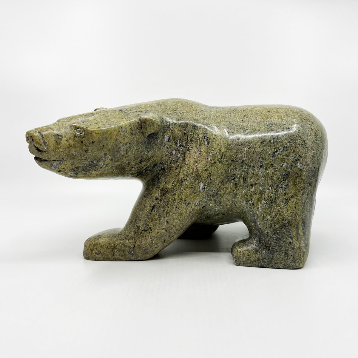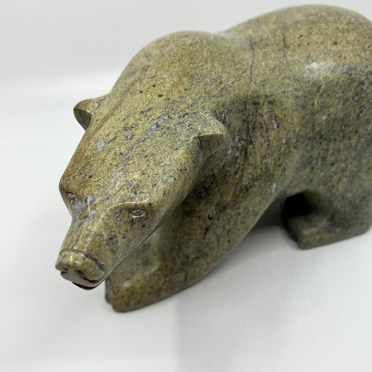 Joanie began carving Inukshuks at the age of 12, and by 14, he developed a passion for carving animals, with polar bears becoming his favorite subject. He attributes his traditional carving skills to the teachings of his older brother, Siutapik, and his grandfather, Inuk Munamie. Joanie skillfully sculpts with dark black or green serpentine stone from the Cape Dorset area, producing detailed and elegant works. Although he carves various wildlife, he has a particular preference for creating bears, often in large or medium sizes. His polar bears are realistically portrayed, capturing both their mass and movement with precision.