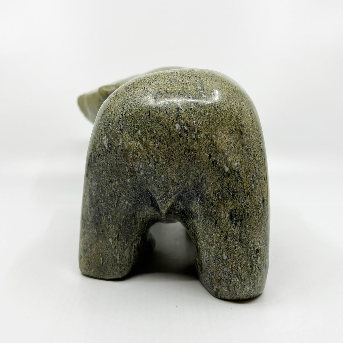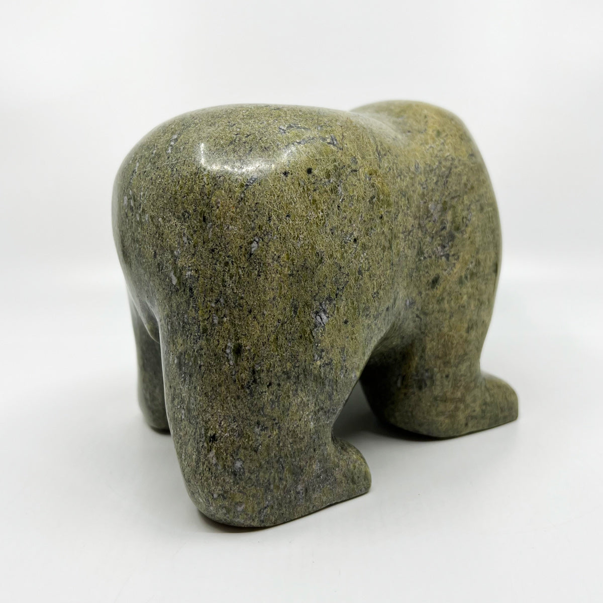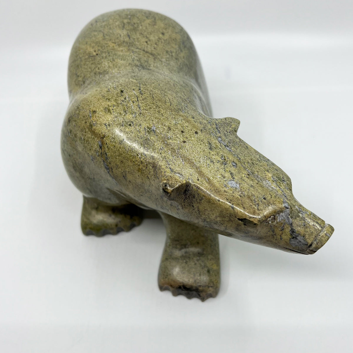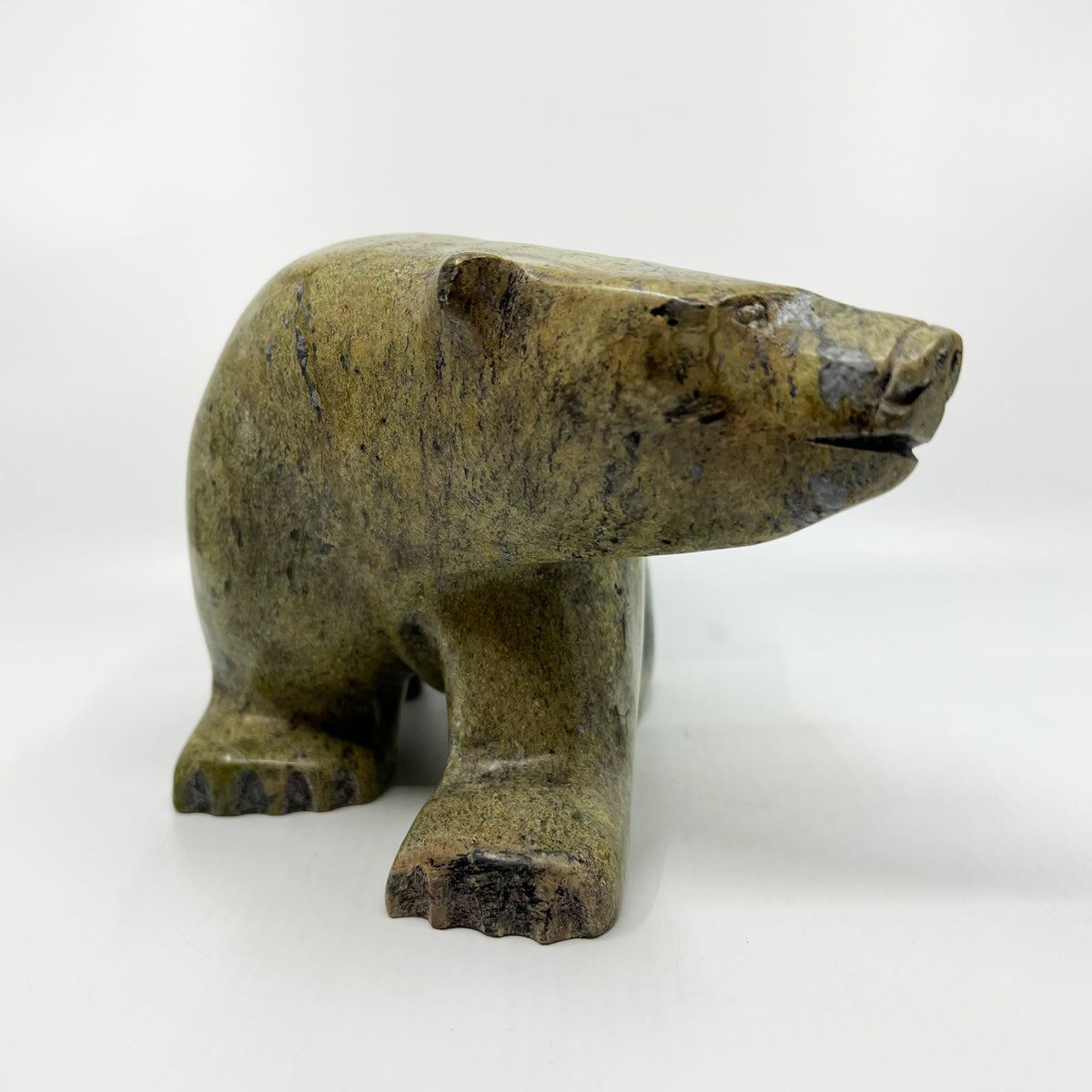 Joanie began carving Inukshuks at the age of 12, and by 14, he developed a passion for carving animals, with polar bears becoming his favorite subject. He attributes his traditional carving skills to the teachings of his older brother, Siutapik, and his grandfather, Inuk Munamie. Joanie skillfully sculpts with dark black or green serpentine stone from the Cape Dorset area, producing detailed and elegant works. Although he carves various wildlife, he has a particular preference for creating bears, often in large or medium sizes. His polar bears are realistically portrayed, capturing both their mass and movement with precision.